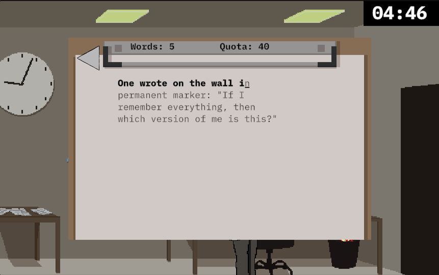This game was a joy to play albeit it being a little stressful with how it just throws you in without a true guide and having to balance a multitude of tasks on top of each other. I feel that with a bit of time spent reworking a few features to balance out each other, this game could truly shine. On the topic of "shining," I feel the graphic designing and sprites of everything could use a little more love. The atmosphere felt a little empty and lackluster for an office that is meant to feel like a coffee-holic's workplace. Atmosphere is heavily lacking, I fear, and the only thing that adds true horror to this game is the loud sound design. Other than my nitpicks, I thoroughly enjoyed the game and its little tasks, especially the typing quota.